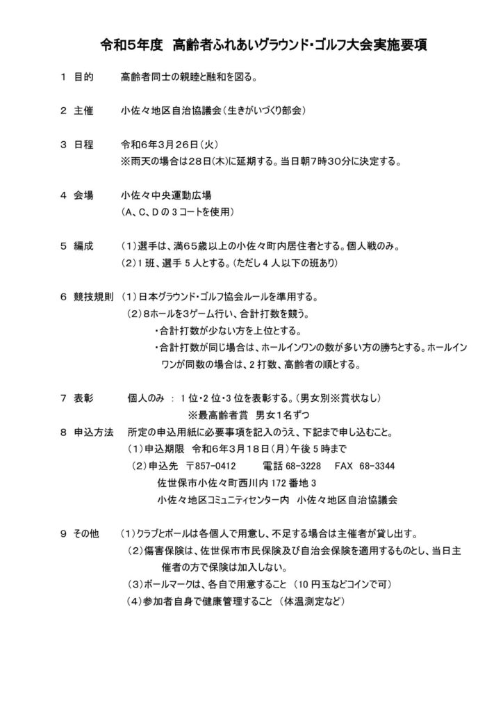 高齢者ふれあいグラウンドゴルフ大会を開催します 2025 8/28 イベント情報 高齢者ふれあいグラウンドゴルフ大会 2024年3月8日2025年8月28日 3月26日(火)に小佐々中央運動広場で開催します。実施要項をご覧の上お申し込みください。 問い合わせ・申込みは小佐々コミセンへ☎0956-68-3228 イベント情報 高齢者ふれあいグラウンドゴルフ大会 よかったらシェアしてね! URLをコピーしました! URLをコピーしました! 関連記事 小佐々町で夏祭りが開催されます! 5月11日開催『西の最果てマルシェ』チラシができました 西の最果てマルシェ、2回目開催します! グッチョが優勝 ~親睦ソフトバレーボール大会 第2回親睦ソフトバレーボール大会のトーナメント決定しました スマホ教室を開催します 第2回小佐々地区親睦ソフトバレーボール大会を開催します! 新着コミセン講座情報