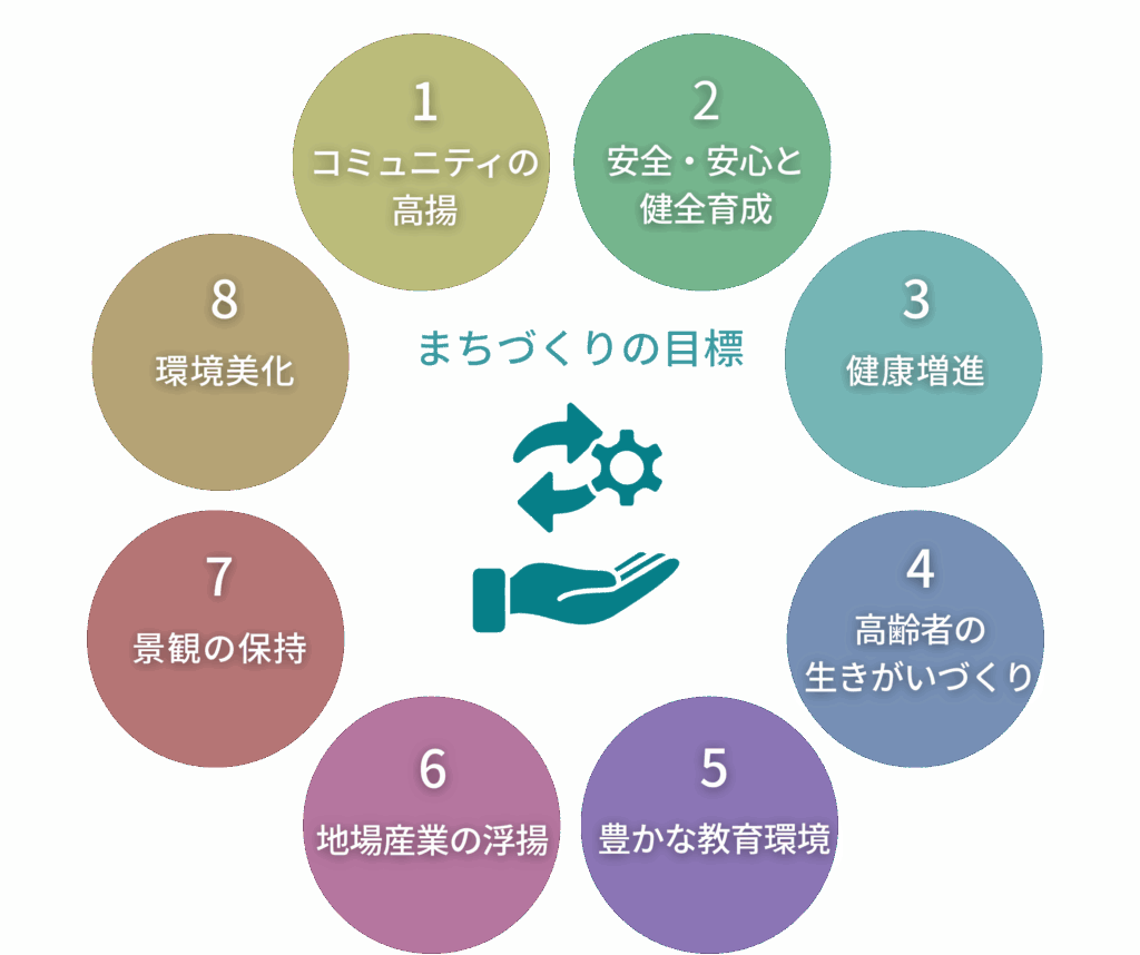 「海光り ひと輝くまち こさざ」をスローガンに、まちづくりの目標として「住みよいまち」「住みたいまち」そして「誇れるまち」を設定しました。これらを実現する基本目標として以下の8つの基本目標を掲げ、取り組んでまいります。