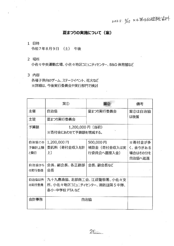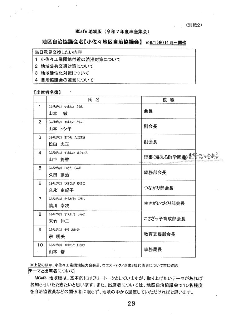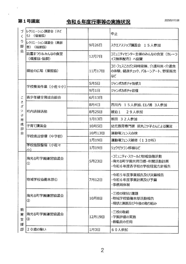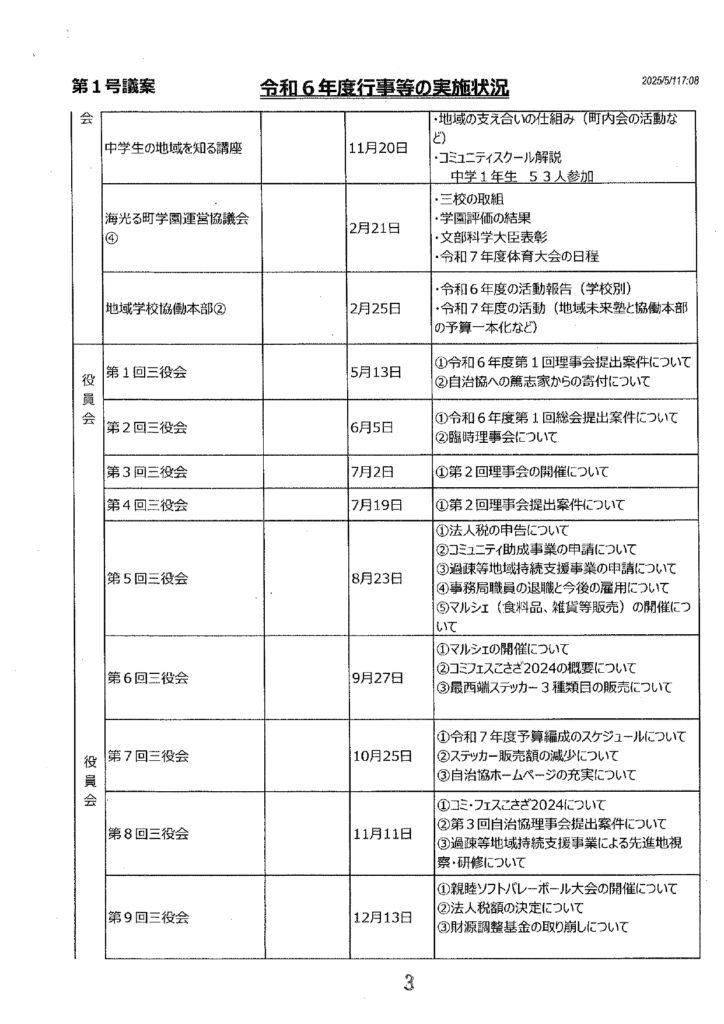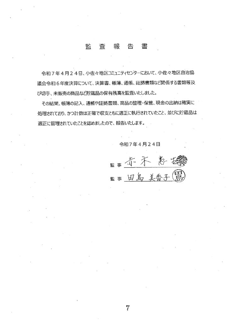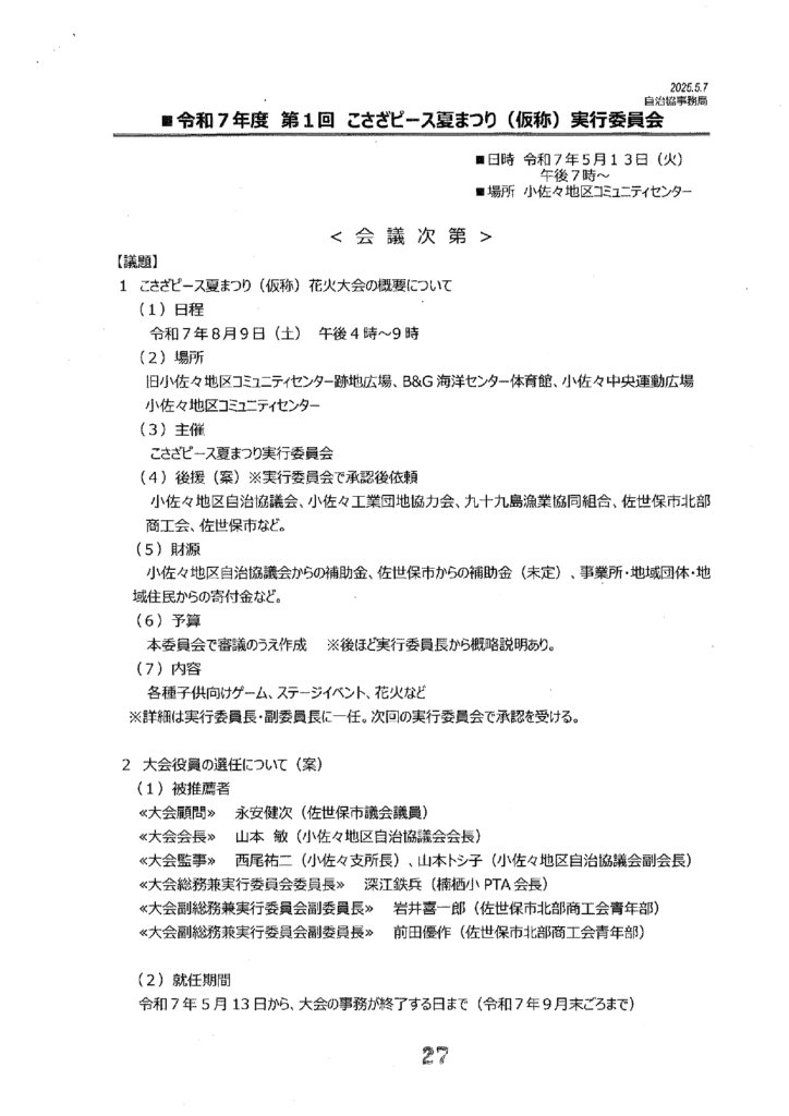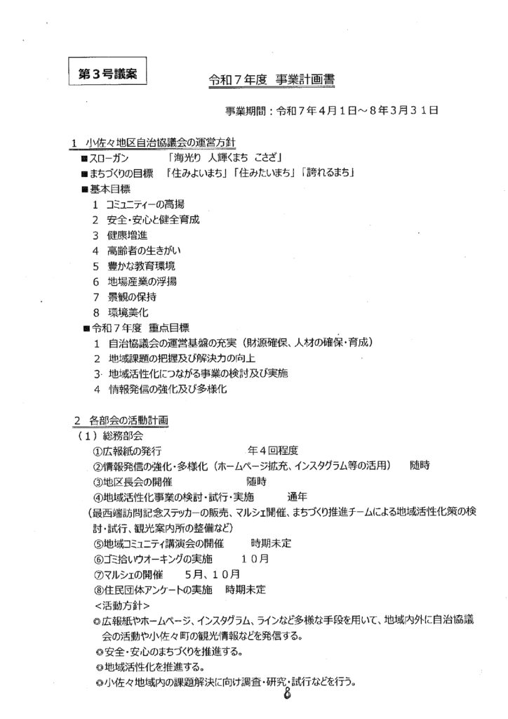 令和7年度 定期総会を開催しました 2025 8/22 街のくらし コミセン 2025年6月24日2025年8月22日 小佐々地区自治協議会総会を6月5日、小佐々地区コミュニティセンターで開催しました。令和6年度事業・決算報告と令和7年度事業計画案・予算案審議などを行い、原案どおり承認されました。資料は添付のとおりです。 問い合わせ・申込みは小佐々コミセンへ☎0956-68-3228 街のくらし コミセン よかったらシェアしてね! URLをコピーしました! URLをコピーしました! 関連記事 6年ぶりに「子ども劇場」を開催 小佐々地区住民の交通手段の確保に向けた研修会を開催しました 生まれ育った町で成人式典 ~2025小佐々20歳を祝う会~ 中学生が地域の支え合いの仕組みなどを学びました 小佐々中吹奏楽部&SASEBO響団が合同でコンサートを開催しました 各地区で敬老会が開催されました 旧小佐々地区コミュニティセンターの跡地活用策について佐世保市へ要望 港町地区で夏まつりが開催されました