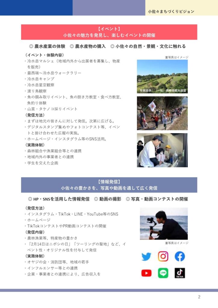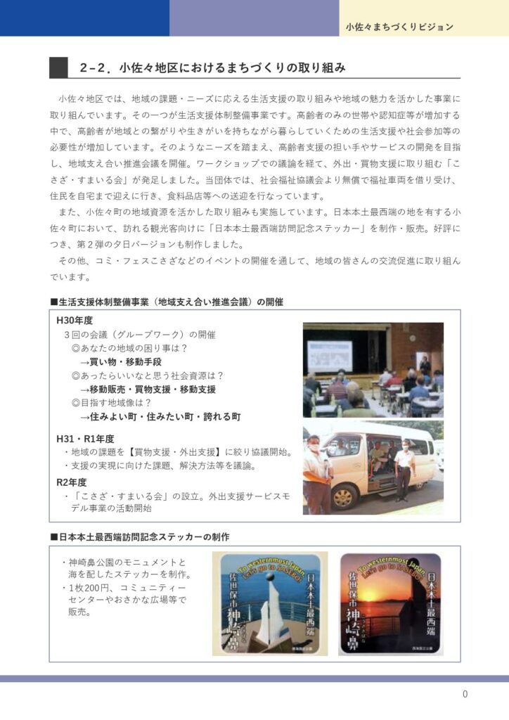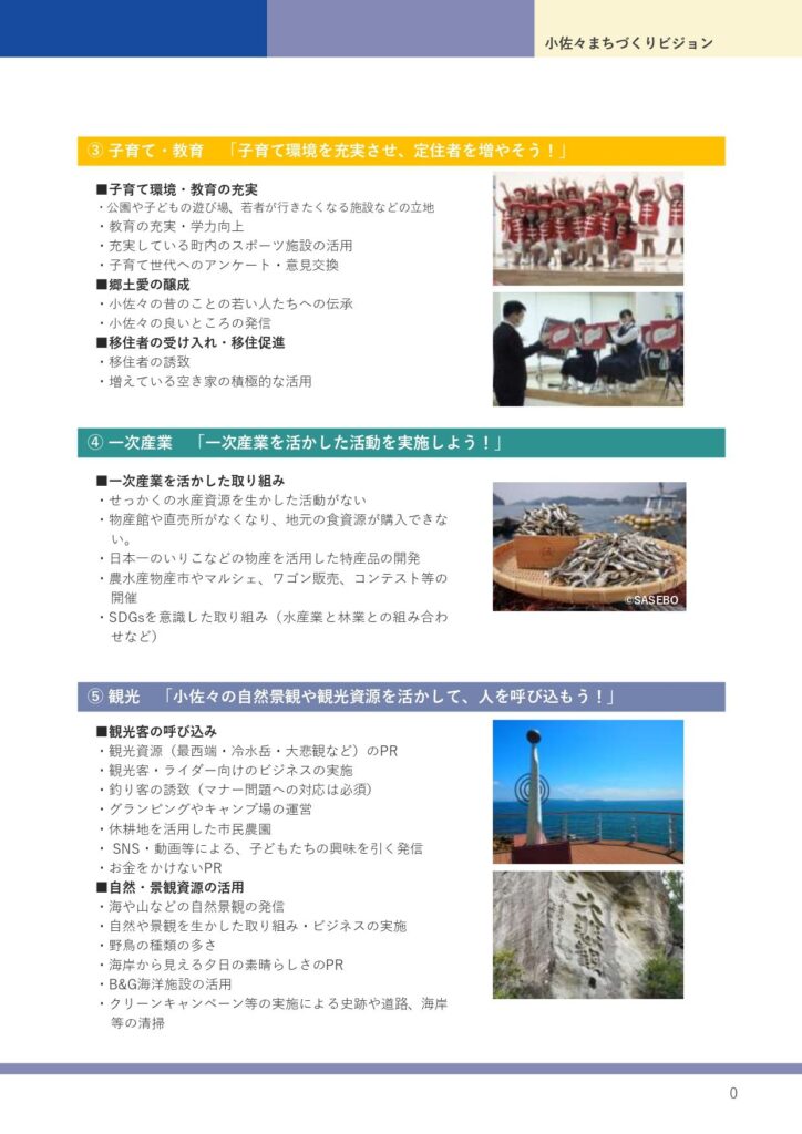 将来にわたり、小佐々地域が活気のある”まち”であり続けることを願って、地域の課題や目指すべき将来像をまとめた「小佐々まちづくりビジョン」を令和5年3月につくりました。