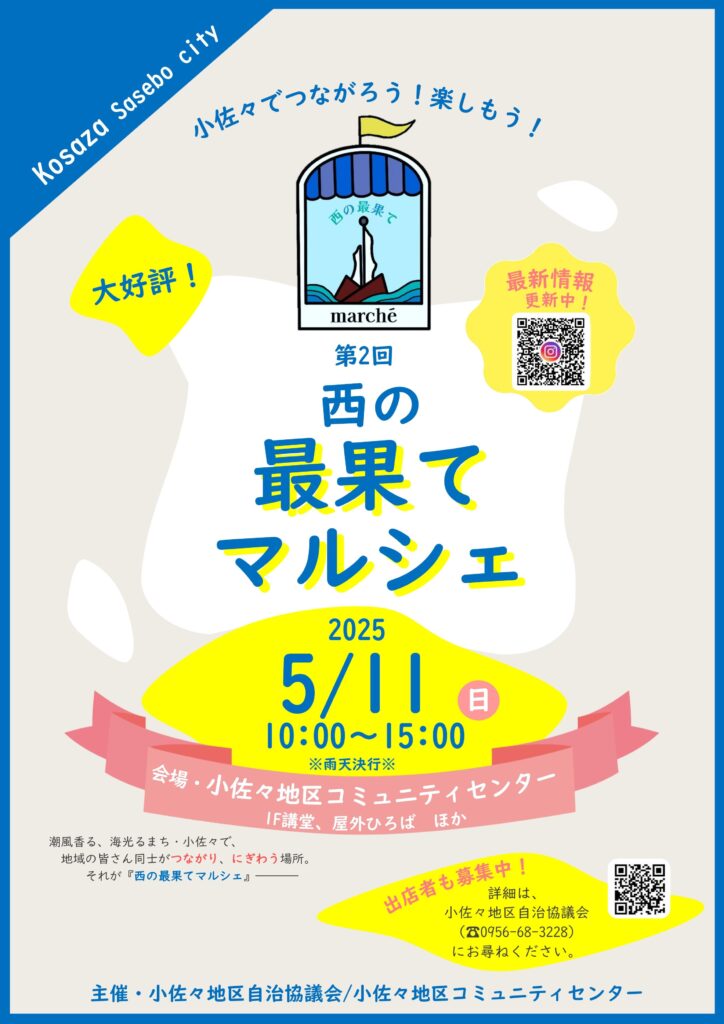 5月11日開催『西の最果てマルシェ』チラシができました 2025 8/28 イベント情報 西の果てマルシェ 2025年4月17日2025年8月28日 今回は特に美味しいものがたくさん集まりますよ♪ぜひ皆さんお越しください(^^) また出店内容など詳しくは自治協インスタで順次公開!そちらもあわせてご覧ください♪ 問い合わせ・申込みは小佐々コミセンへ☎0956-68-3228 イベント情報 西の果てマルシェ よかったらシェアしてね! URLをコピーしました! URLをコピーしました! 関連記事 小佐々町で夏祭りが開催されます! 西の最果てマルシェ、2回目開催します! グッチョが優勝 ~親睦ソフトバレーボール大会 第2回親睦ソフトバレーボール大会のトーナメント決定しました スマホ教室を開催します 第2回小佐々地区親睦ソフトバレーボール大会を開催します! 新着コミセン講座情報 「コミ・フェスこさざ2024」を開催しました